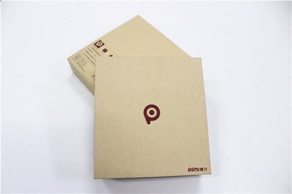 里层采用灰底白板开V型槽,将PPTV盒子牛皮纸天地盒的线条感完美的表现了出来,使包装看上去线条明朗棱角分明。