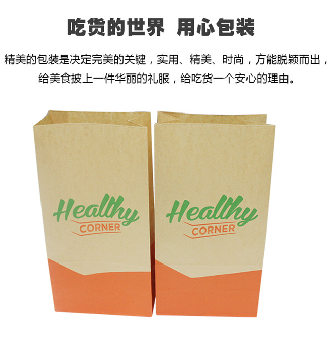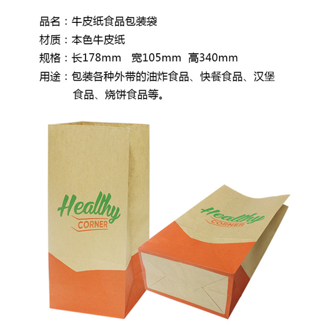 50g食品级牛皮纸,橙绿双色印刷,制成风琴袋,因牛皮纸是食品级,可直接接触食品,环保无毒。用途:包装各种油炸食品,快餐食品,汉堡食品、烧饼食品等。