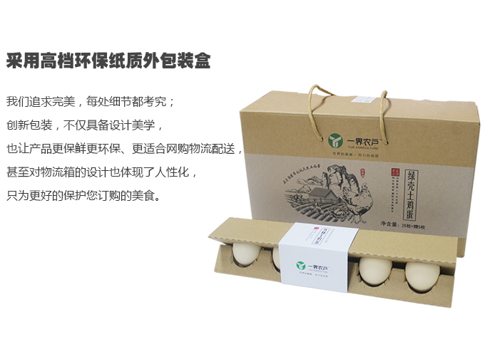 一界农户土鸡蛋礼品包装盒我们追求完美,每处细节都考究;创新包装,不仅具备设计美学,也让产品更保鲜、更环保、更适合网购物流配送;甚至对物流箱的设计也体现了人性化,只为更好的保护您订购的美食。