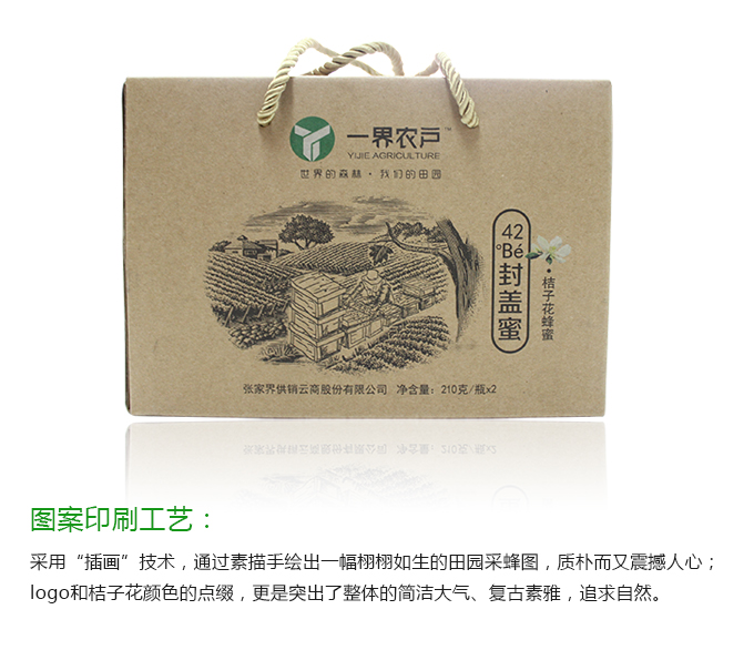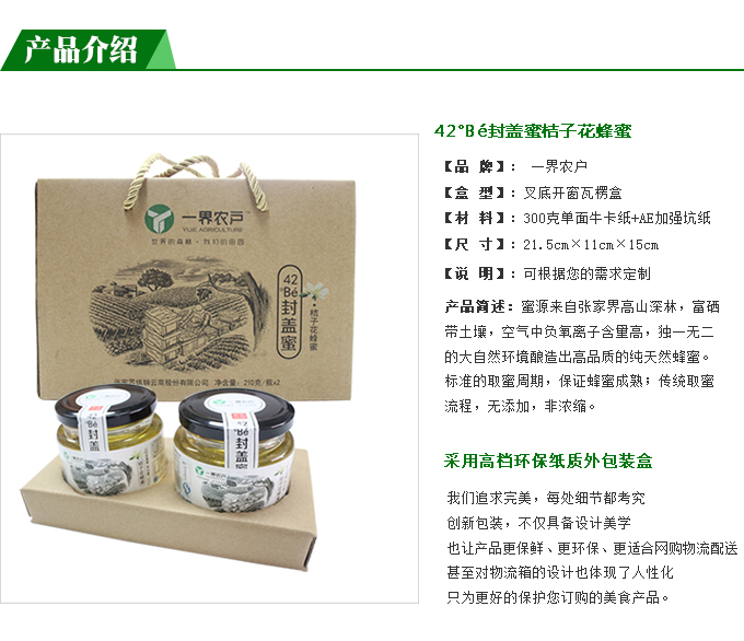 42°Bé封盖蜜桔子花蜂蜜采用高档环保纸质外包装盒,我们追求完美,每处细节都考究;创新包装,不仅具备设计美学,也让产品更保鲜、更环保、更适合网购物流配送,甚至对物流箱的设计也体现了人性化,只为更好的保护您订购的美食产品。