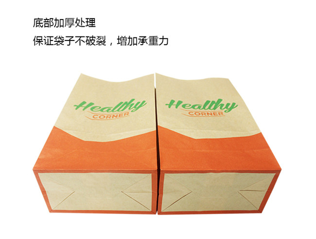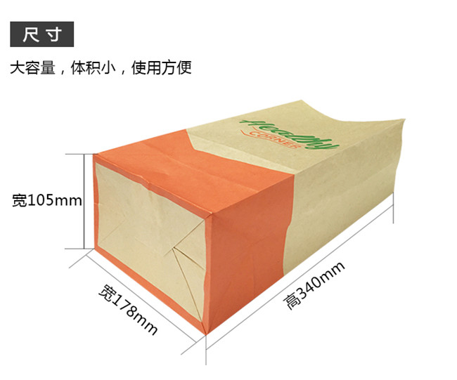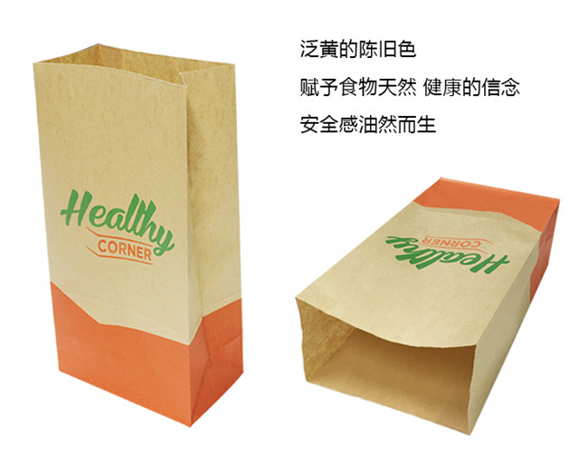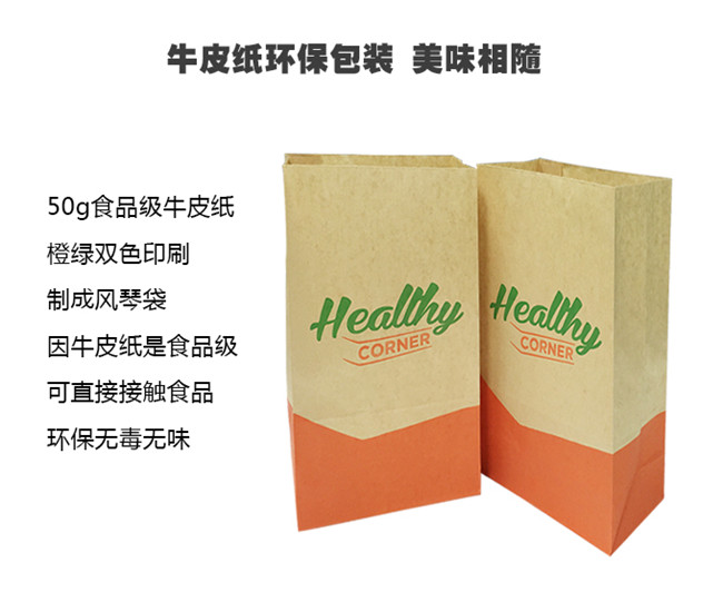 50g食品级牛皮纸,橙绿双色印刷,制成风琴袋,因牛皮纸是食品级,可直接接触食品,环保无毒。用途:包装各种油炸食品,快餐食品,汉堡食品、烧饼食品等。