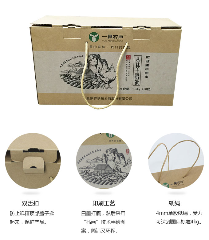 一界农户土鸡蛋礼品包装盒我们追求完美,每处细节都考究;创新包装,不仅具备设计美学,也让产品更保鲜、更环保、更适合网购物流配送;甚至对物流箱的设计也体现了人性化,只为更好的保护您订购的美食。